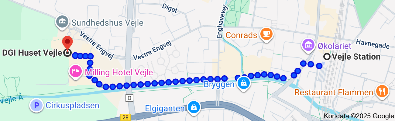 Tag gerne Bus nr. 6, lige til døren, fra Vejle trafikcenter til DGI Huset.